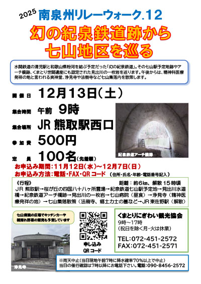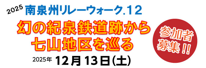南泉州リレーウォークは貝塚市から岬町までの7市町が、順番に1年をかけツアーを実施しています。 今年の熊取町は、「幻の紀泉鉄道跡から七山地区を巡る」です。
